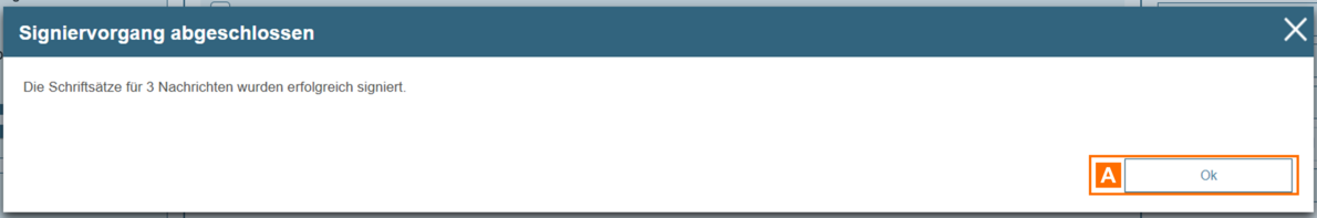 Wurden alle Anhänge (Schriftsätze) der ausgewählten Nachrichten erfolgreich signiert, wird Ihnen eine Bestätigung angezeigt.