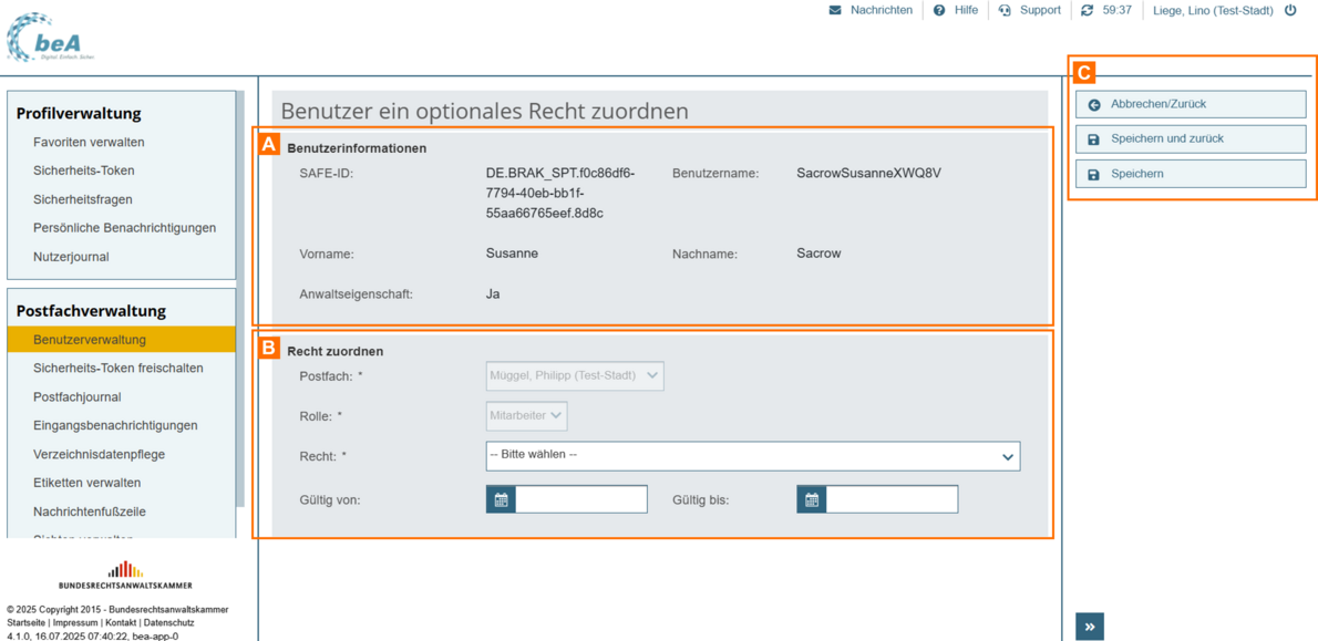 | Anwaltseigenschaft | In diesem Anzeigefeld wird angezeigt, ob der Benutzer als Rechtsanwalt zugelassen ist. |