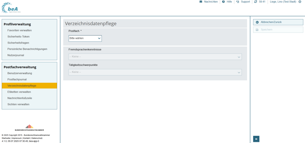 In diesem Dialog kann der Benutzer seinem Postfach Fremdsprachenkenntnisse und Tätigkeitsschwerpunkte hinzufügen, die im Verzeichnis "Find a lawyer" (FAL) auftauchen und es ermöglichen, dass Anwältinnen und Anwälte über diese Kriterien besser gefunden werden können.
